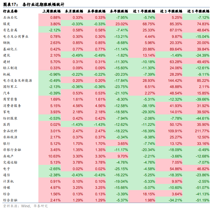 按中信行业分类来看,在 30 个行业指数中,仅有煤炭、房地产和银行三个行业指数获得正收益,余下27个行业指数均有不同幅度的回撤。
