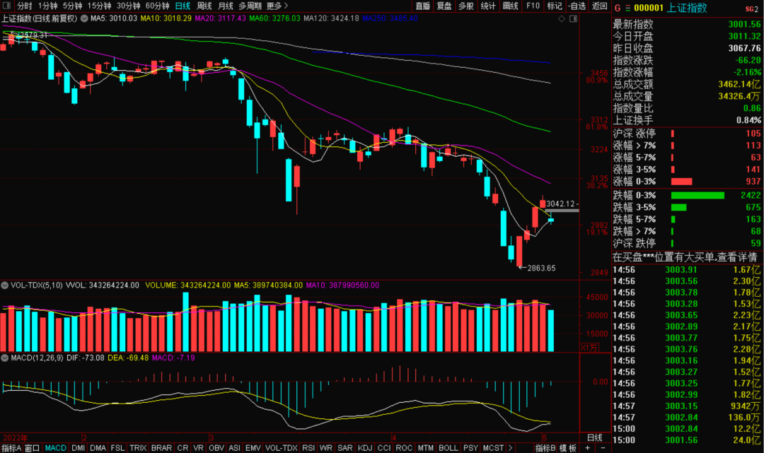 沪指经过四天的反弹,今天再显颓势,三大指数跌幅都比较大,沪指3000点反复被考验!只有少数的互联网电商、国产软件概念股持续强势,酒店、机场航运、白酒、房地产板块持续下行,两市超3000只股票飘绿,成交明显萎缩到7000亿元附近,今天是正常调整还是反弹结束?