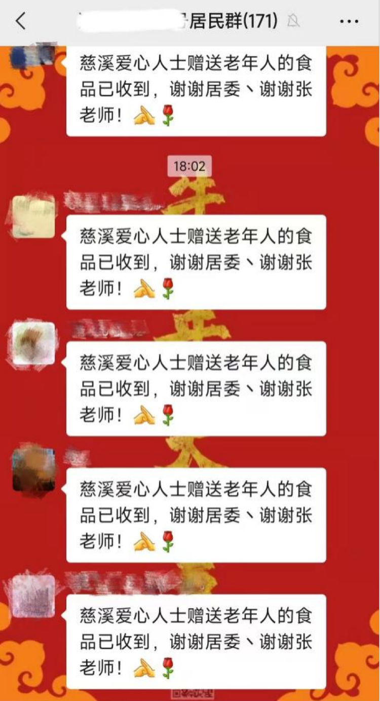 收到礼包后,社区居民纷纷在群里表达对慈溪爱心人士群体的感谢。“慈溪爱心人士赠送的老年人的食品已收到……”“谢谢慈溪爱心人士群体!”“很意外,一时哽咽了,谢谢慈溪爱心人士!”一时间,温馨与感激的情绪在群中蔓延,与远方的同胞一同共鸣。