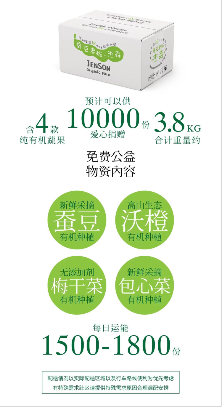近日,周到君收到了一个好消息:由来自浙江慈溪的爱心人士虞煊牵头,联合慈溪市龙武渔业专业合作社、余姚市河姆渡虞家幸福生态农场、慈溪聚福果蔬农场、迈康实业(上海)有限公司4家企业组成的爱心团队,将免费为上海社区独居老人捐赠爱心物资礼包。据悉,礼包内容包含蚕豆、沃橙、梅干菜、包心菜4款有机蔬果,为社区居民送上一份来自“邻居”的温暖。