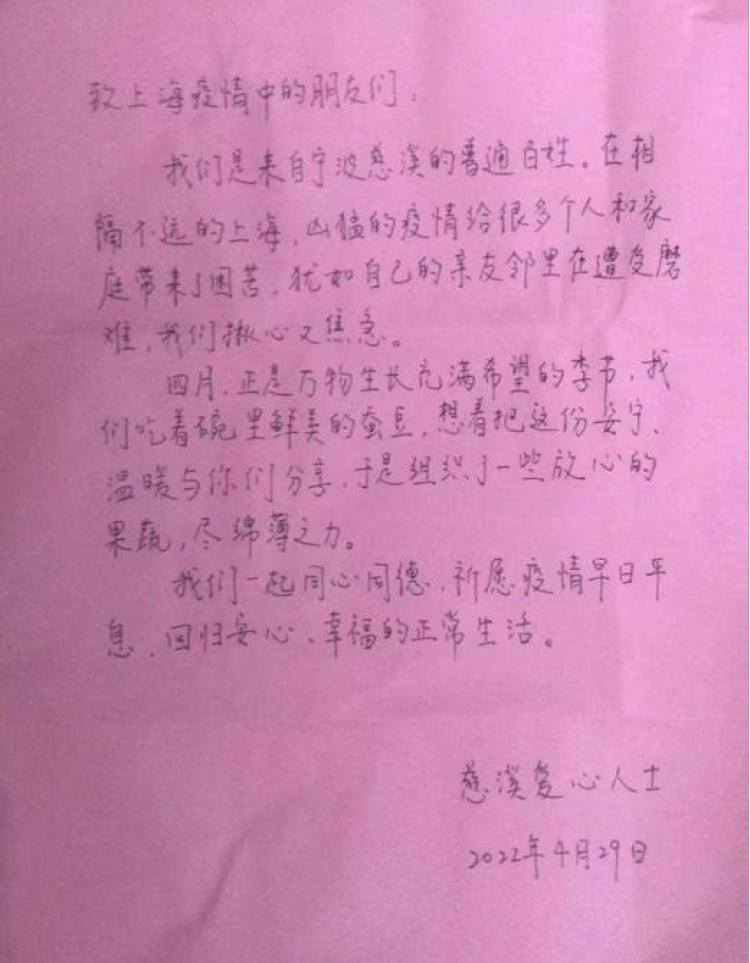 “……正是万物生长充满希望的季节,我们吃着碗里鲜美的蚕豆,想着把这份安宁、温暖与你们分享,于是组织了一些放心的果蔬,尽绵薄之力。”在爱心人士写给上海市民的信中,他们这么说,“我们一起同心同德,祈愿疫情早日平息,回归安心、幸福的正常生活。”