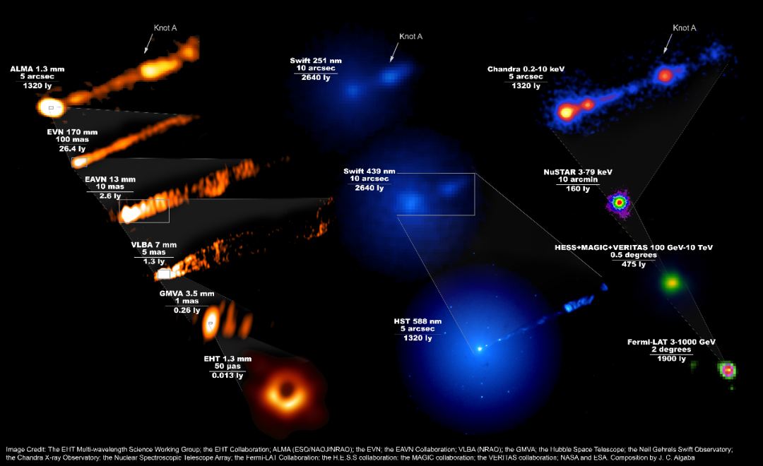 M87的多波段观测结果,天马射电望远镜参加其中EVN的170mm和EAVN的13mm及7mm观测。 |EventHorizonTelescopeCollaboration
