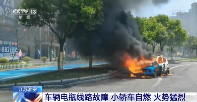 江苏淮安:车辆电瓶线路故障 小轿车自燃 火势猛烈