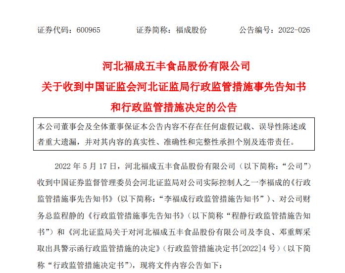 中新经纬5月18日电 福成股份17日晚间发布公告称,河北证监局对公司实控人李福成、财务总监程静下发《行政监管措施事先告知书》,拟对上述人员采取认定为不适当人选的监管措施。