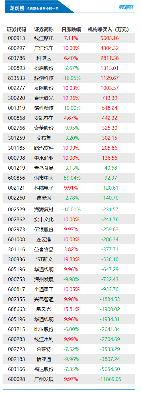 当天机构净买入前三的股票分别是钱江摩托、广汇汽车、科博达,净买入金额分别是5603万元、4304万元、2811万元。