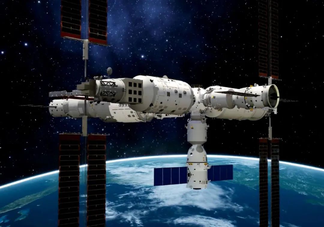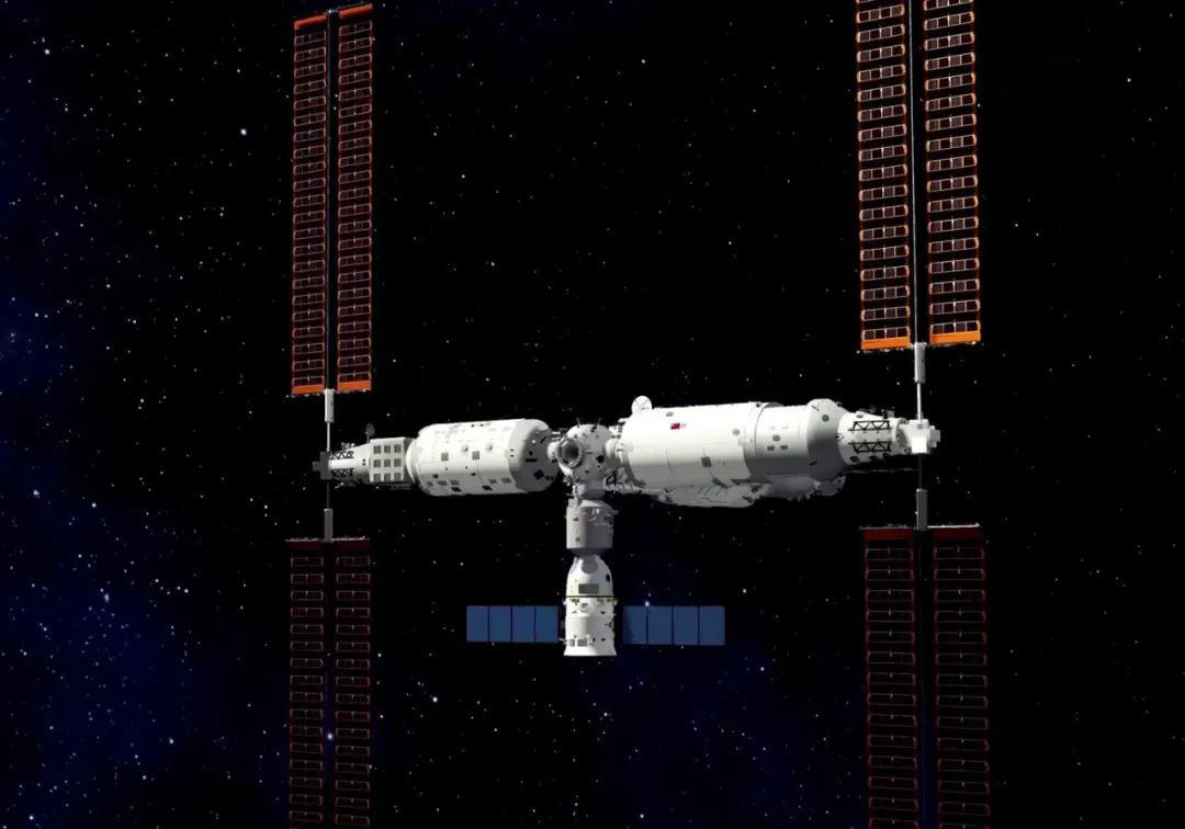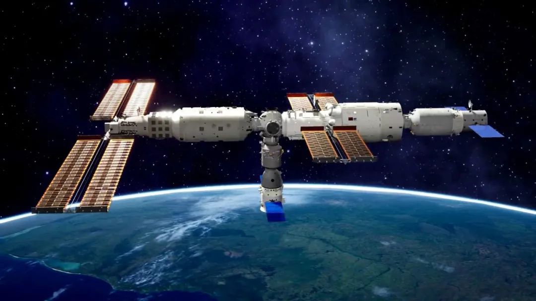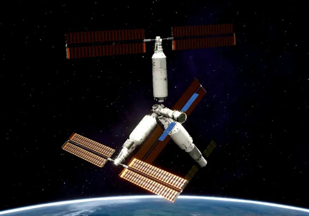 神舟十四号升空后,和神舟十三号一样,对接天和核心舱朝向地球方向的径向对接口。天和核心舱一前一后,分别是天舟三号和天舟四号货运飞船,构成一个小T字构型。
