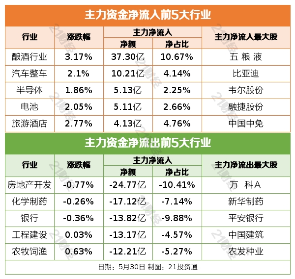 5月30日,A股三大股指集体上涨,酒店餐饮、酿酒、船舶、汽车、国企改革等板块领涨,其中汽车和国企改革两个板块上演涨停潮。北向资金净买入70.49亿元,其中沪股通净买入24.82亿元,深股通净买入45.67亿元。