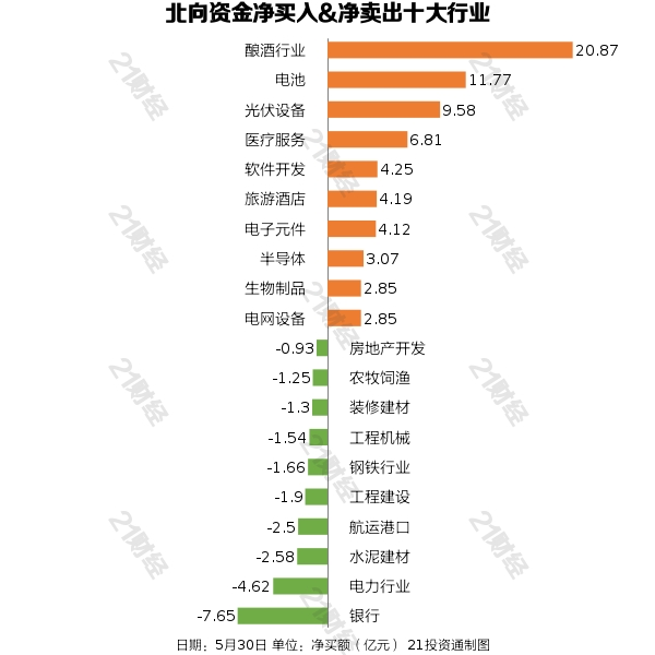 从净买入金额来看,北向资金增持了65个行业,其中酿酒行业居首,净买入金额达20.87亿元,北向资金减持了35个行业,其中银行最多,净卖出金额达7.65亿元。