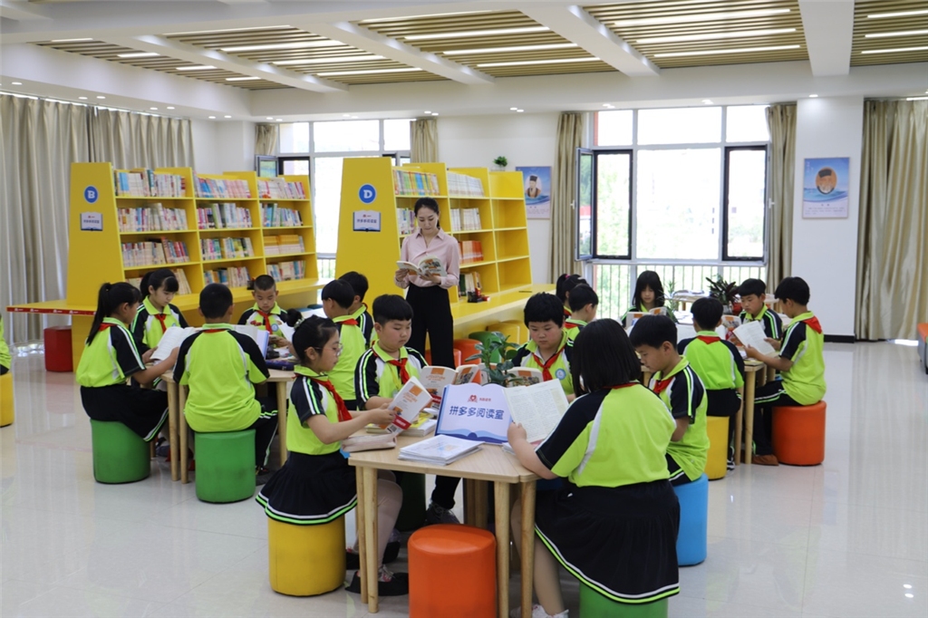 ▲青龙第四小学的师生在“为你读书”拼多多阅读室一起阅读,领略书香。李涛丨摄