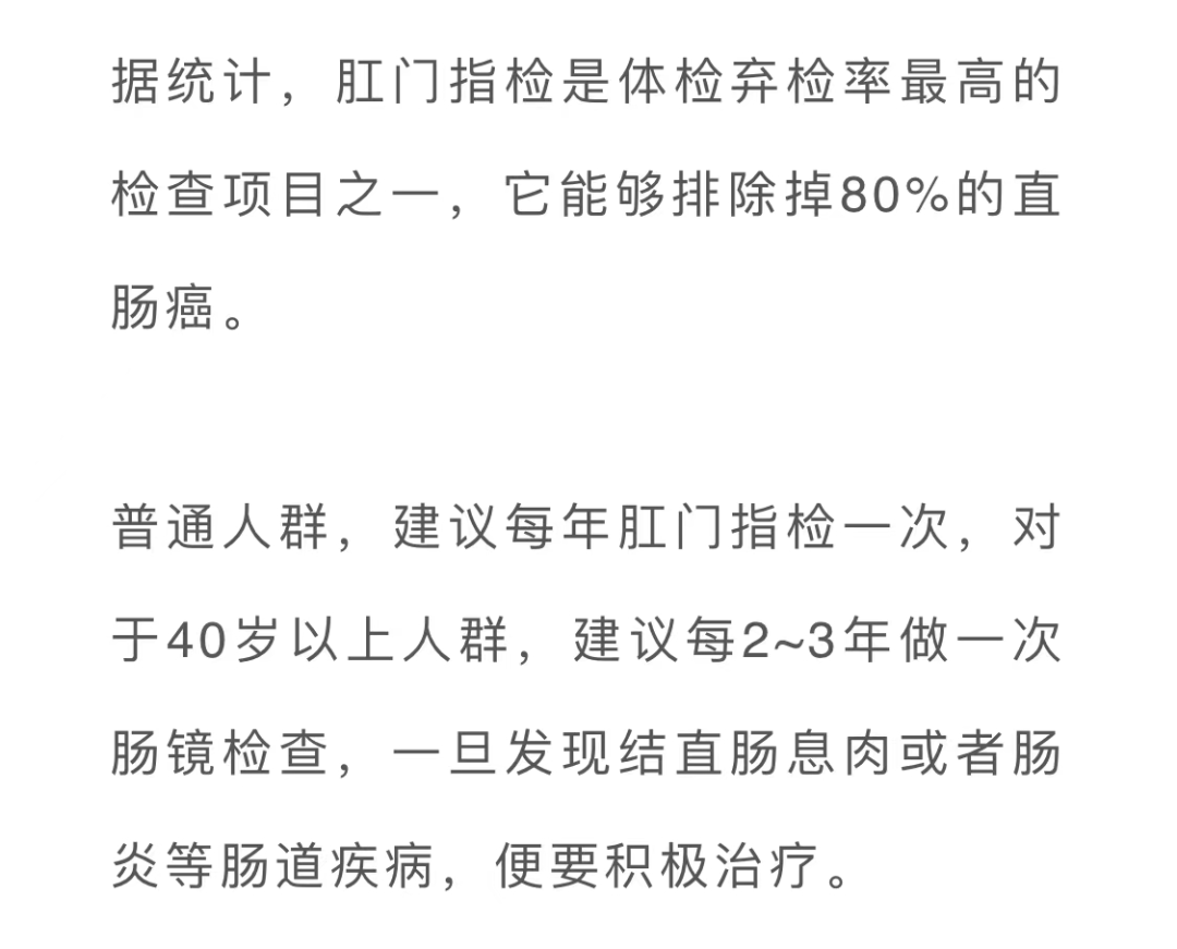 目前认为,让专业的肛肠科医生做一个肛门指检,或是在医生指导下完善肠镜等相关检查,都是筛查直肠癌的重要手段。
