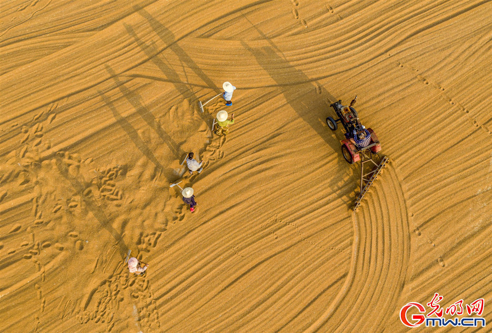 在安徽省合肥市庐江县白湖镇省级现代农业示范基地,农民在谷场上翻晒小麦。(左学长 摄/光明图片)