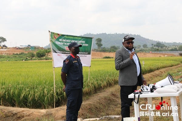 尼日利亚国家农业种子委员会主任奥乔(右)肯定中地海外绿色农业西非公司杂交水稻种植现场会成效。(王新俊 摄)
