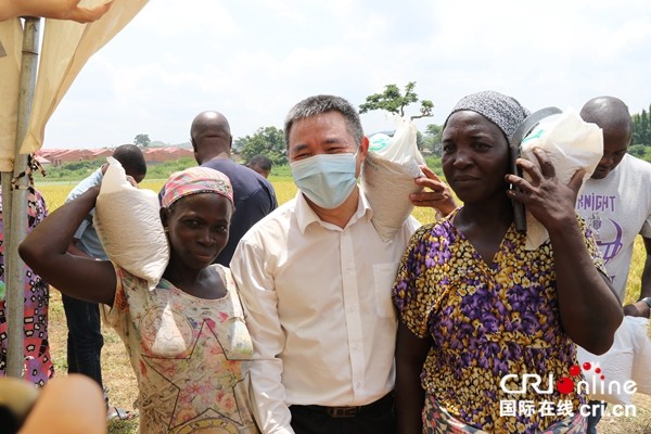 中地海外绿色农业西非公司向当地农户赠送杂交水稻种子。(王新俊 摄)