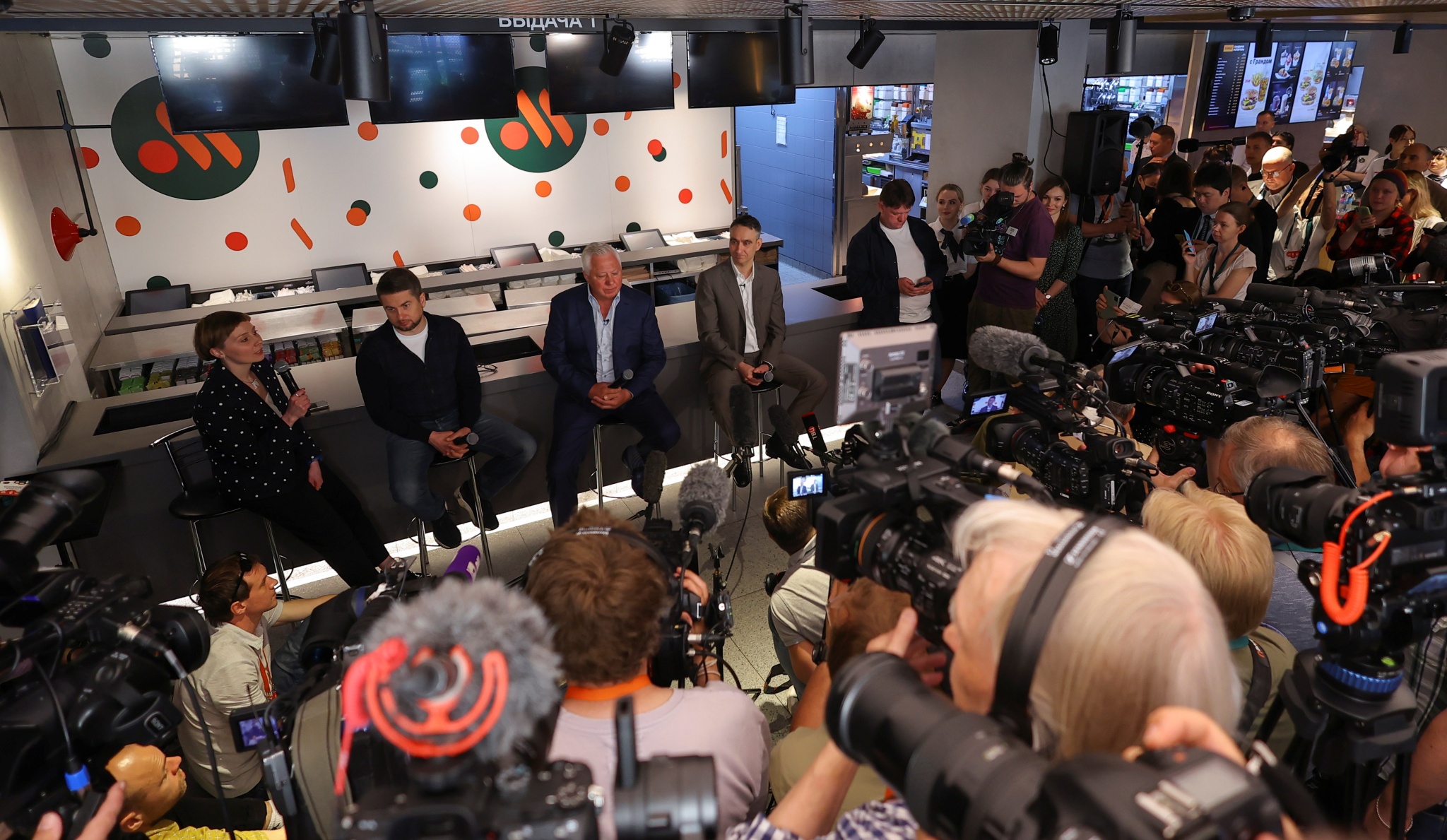当地时间2022年6月12日,俄罗斯莫斯科普什金斯卡亚广场,麦当劳改名为“就是这么好吃”重新开业,俄罗斯商人亚历山大·戈沃尔在新开业的餐厅里接受采访。