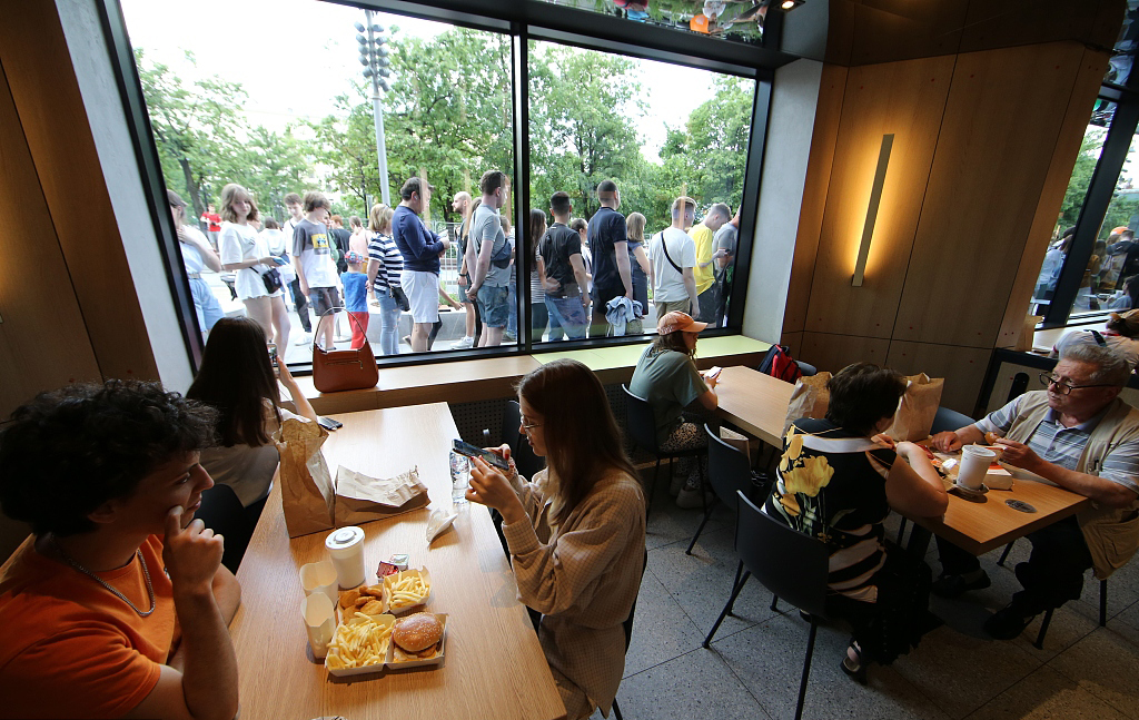 当地时间2022年6月12日,俄罗斯莫斯科,麦当劳改名为“就是这么好吃”重新开业,人们在餐厅就餐。
