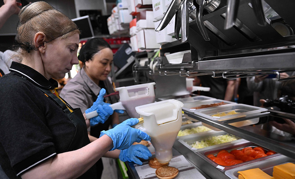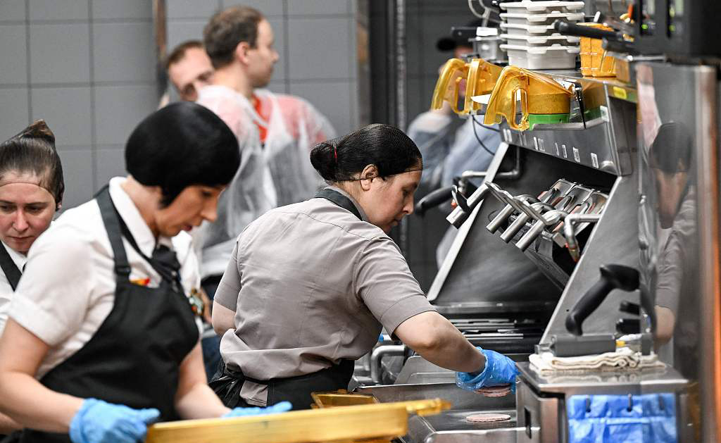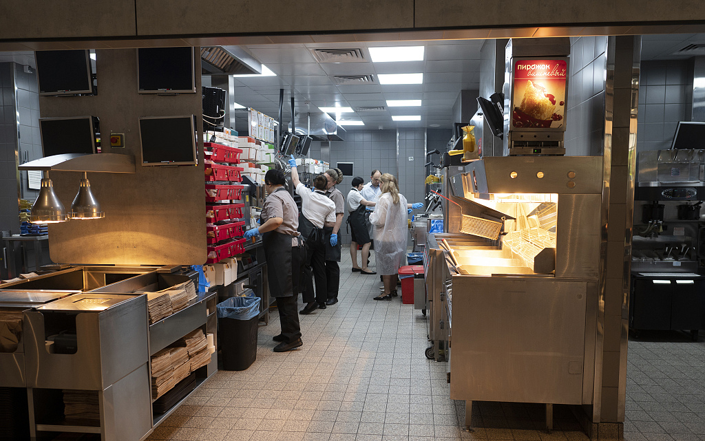 当地时间2022年6月12日,俄罗斯莫斯科,麦当劳改名为“就是这么好吃”重新开业,店员在厨房制作快餐。