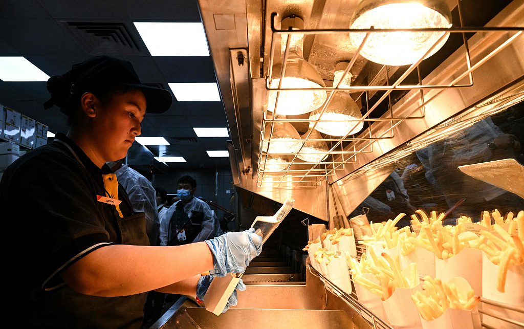 当地时间2022年6月12日,俄罗斯莫斯科,麦当劳改名为“就是这么好吃”重新开业,店员制作薯条。