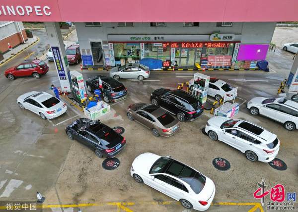 6月14日,车辆排队在山东烟台一家加油站加油。图片作者:唐克/视觉中国