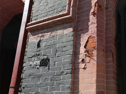 吴振邦提到,修缮格致楼的另一个难题在于,历史上,格致楼传统的清水砖墙被红色和灰色涂料覆盖。这是一种对外立面墙“描画”的维修处理手法,即对老墙表面粉刷和涂料后,以涂料画缝的方式做出砖缝效果。但由于涂料本身透气性较差,阻碍了原有砖体的“呼吸”,在长期自然侵蚀下,容易导致表面粉刷起壳、涂料脱落,局部修补痕迹明显,外立面感官失真。