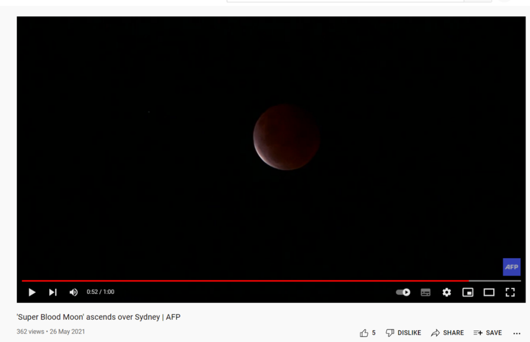 2021年5月25日至27日晚,一场超级月食在大洋洲、夏威夷、亚洲东部和南极洲等地上演。法新社对此亦有报道,并在希腊雅典和澳大利亚悉尼等地捕捉到了月食发生瞬间的图片,互联网上遂有“超级月亮遮天蔽日的视频和消息”传出。