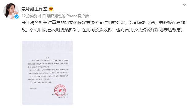 消息发布后,袁冰妍工作室发表相关动态向公众致歉。