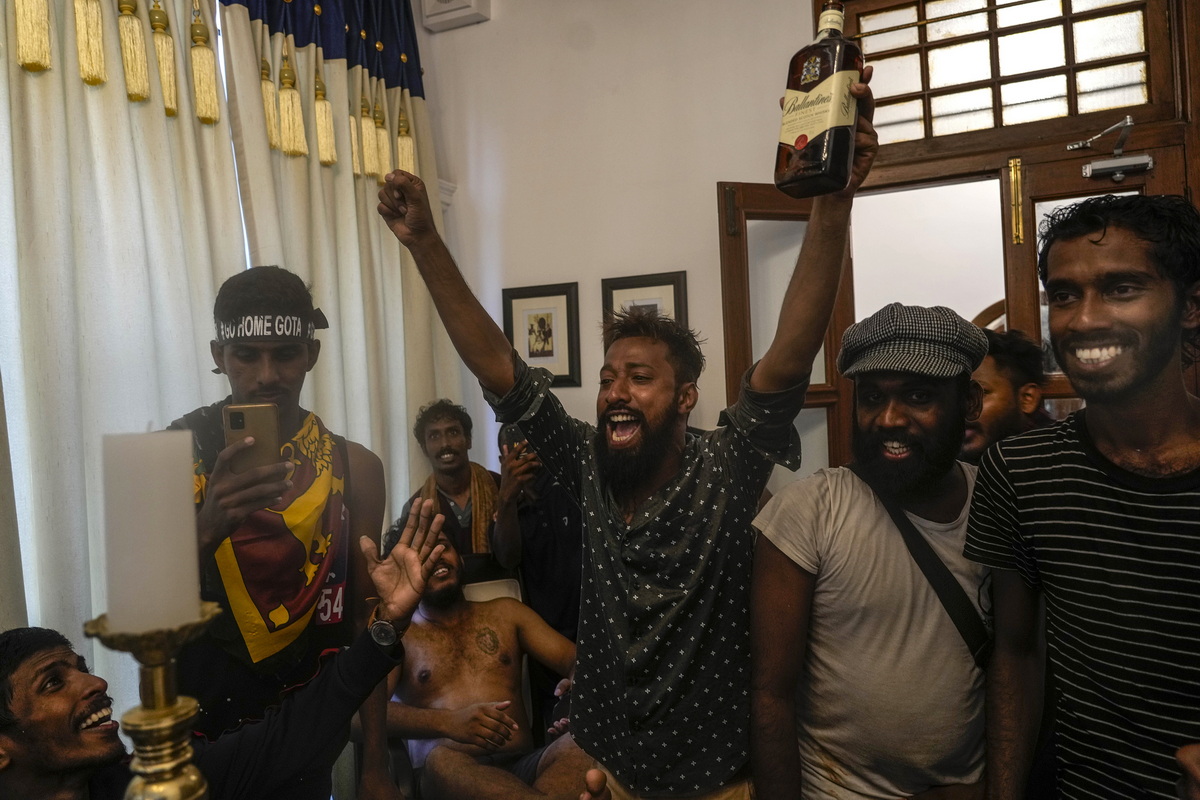 2022年7月13日,斯里兰卡科伦坡,抗议者在冲入总理办公室后庆祝。
