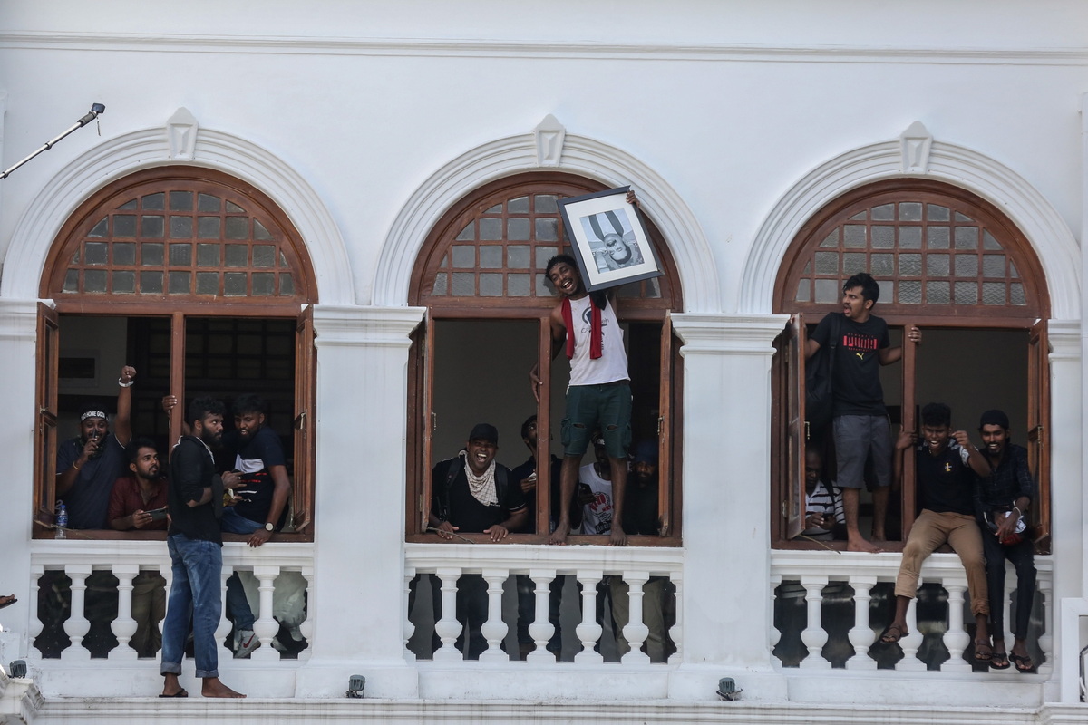 2022年7月13日,斯里兰卡科伦坡,示威者冲入总理办公室大楼后欢呼。
