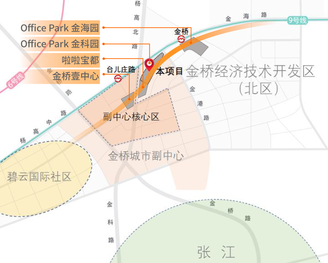 OfficePark金科园紧邻金桥城市副中心核心区,与西侧的“金桥壹中心”、南侧的“啦啦宝都上海金桥”、以及东侧的“OfficePark金海园”项目遥相呼应。