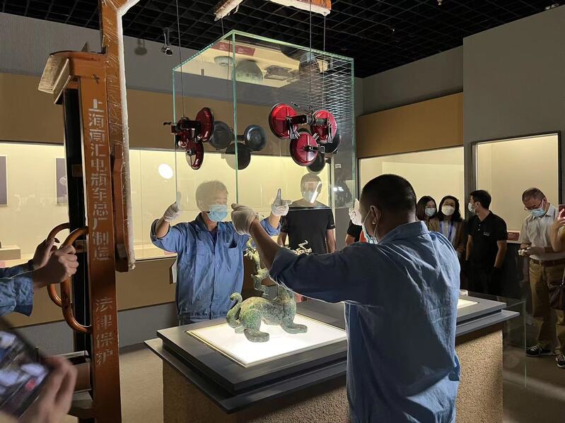 当这尊神兽在展台上再现英姿之后,工作人员用吊车将与展台匹配的玻璃展柜举起,尽管吊车吸盘已固定住展柜,仍有两名工作人员从两侧扶握,让展柜缓缓贴近展台。就在即将触碰展台之时,工作人员再手动微调,将展柜卡进精准的位置。“这个过程在业内叫做‘封箱’。”记者在现场看到,仅调整玻璃柜位置就持续了近10分钟,工作人员坦言,“是为了文物安全和展陈效果。”