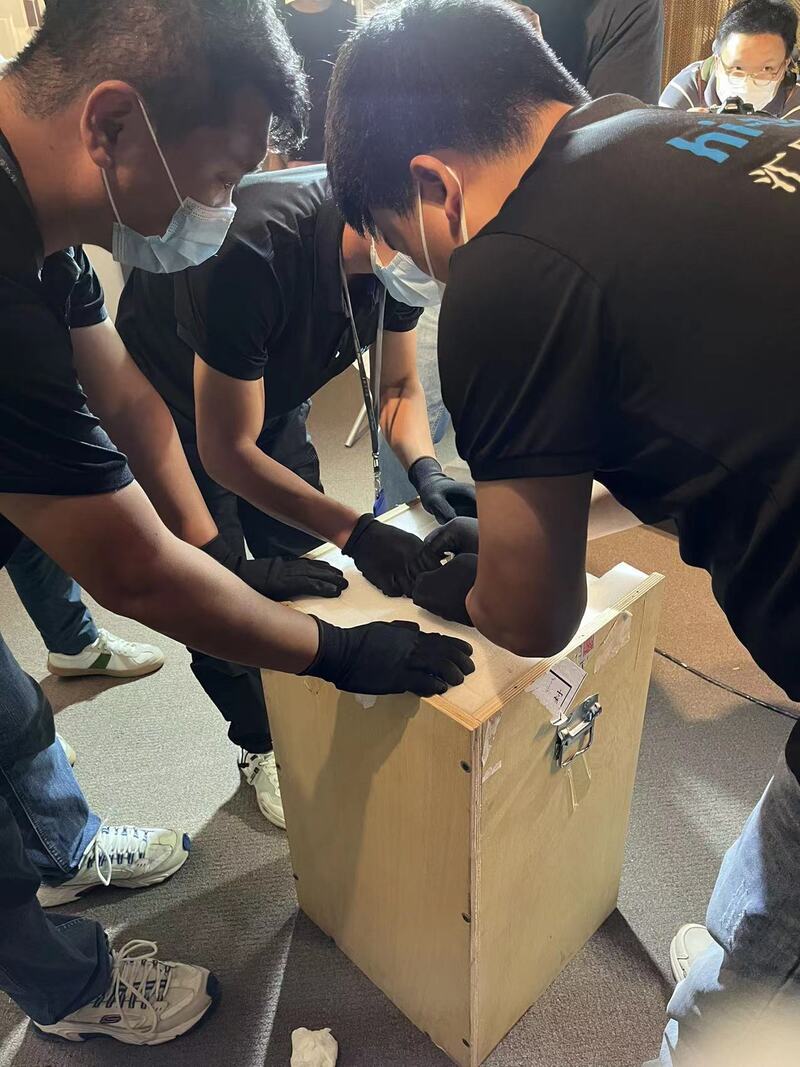 13点42分,三名工作人员拆掉大箱上的螺丝钉,抬开上方和前方的盖板,从铺满海绵的箱子内抱出一个个小箱子。其中略大的一个箱子30厘米见方、约80厘米高,两名工作人员再拆开这一箱子,拉开层层叠叠的海绵,再从中抱出一大一小被防潮软纸裹起的包裹,剥开层层包装,露出蓝绿色的一角,原来是河南博物院九大镇馆之宝之一的妇好鸮尊。