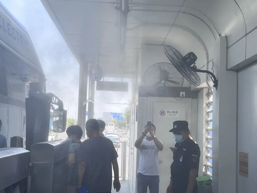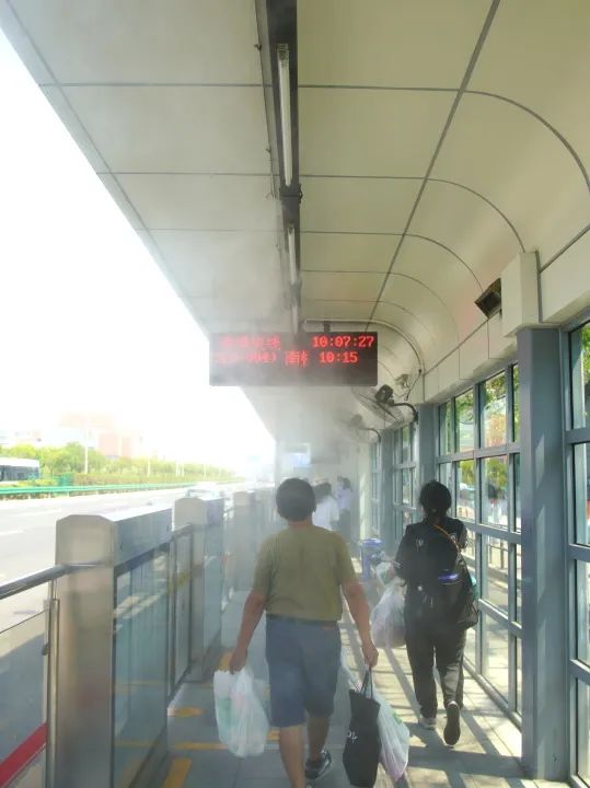 7月26日,沈杜公路站点的喷雾降温装置启动啦!全站共设有87个喷嘴,大家可别小瞧这小小的装置,间断性喷洒的雾气能够让整个站点快速降温,既环保又舒适。