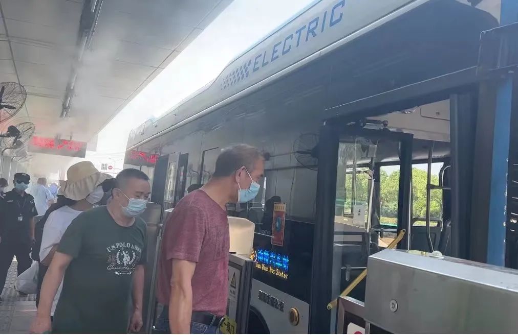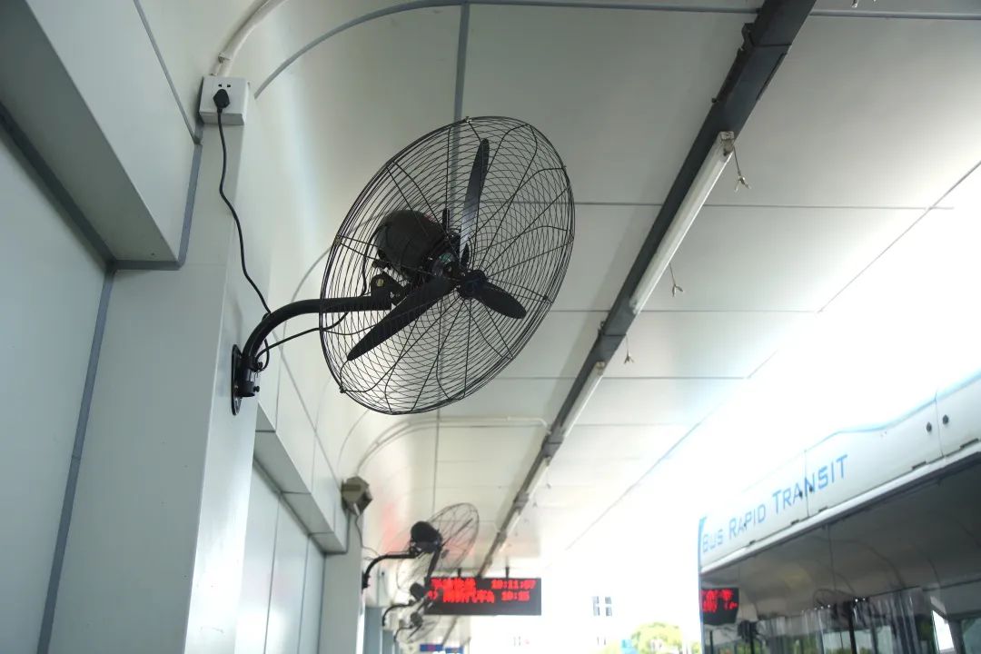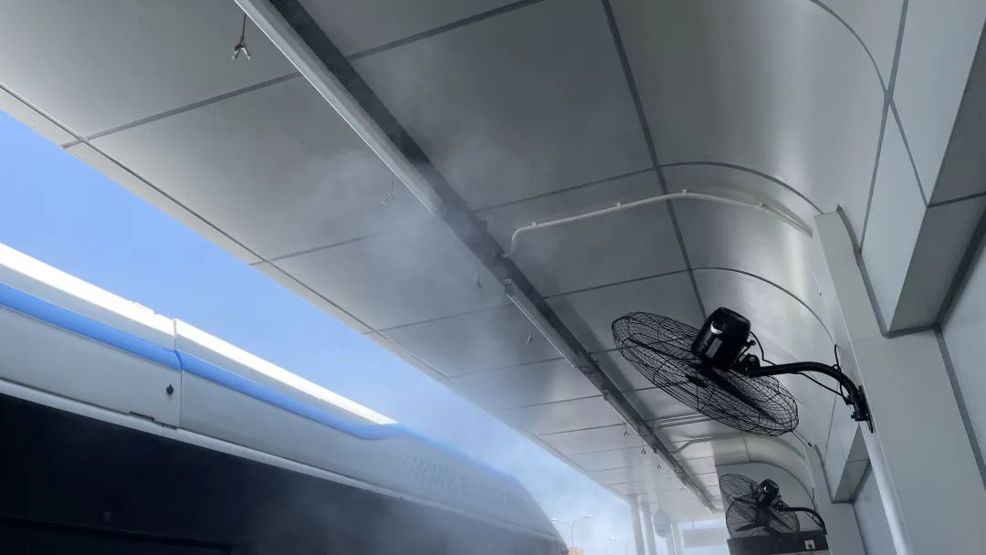 站点还设置了6个大功率风扇,同喷雾降温装置交替启动,为候车的乘客们解暑降温。