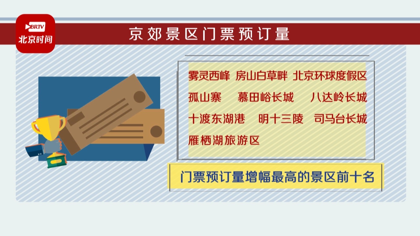 京郊景区门票预订量看,雾灵西峰、房山白草畔、北京环球度假区、孤山寨、慕田峪长城、八达岭长城、十渡东湖港、明十三陵、司马台长城、雁栖湖旅游区,为门票预订量增幅最高的景区前十名。
