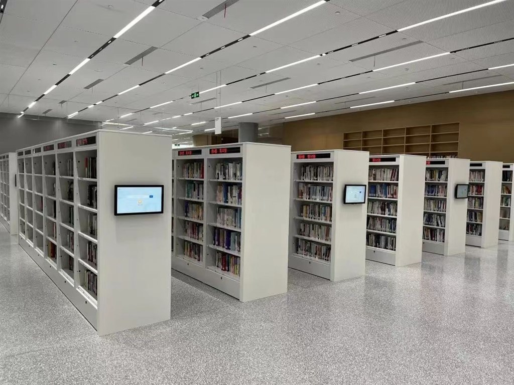 在阅读广场的桌椅侧面是成排的书架,为读者提供借阅一体服务。在智能书架侧面的检索屏幕上,输入书名,就能快速导航到具体书架和层架。