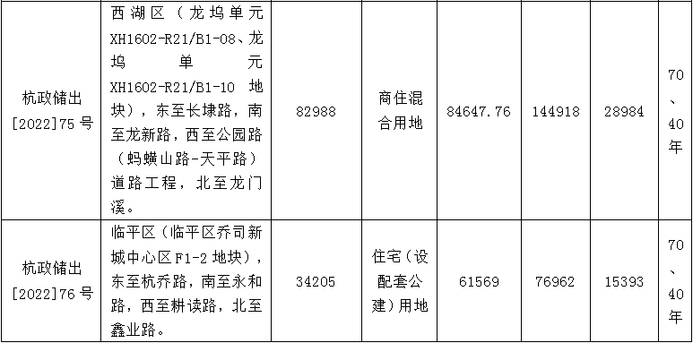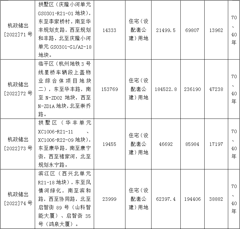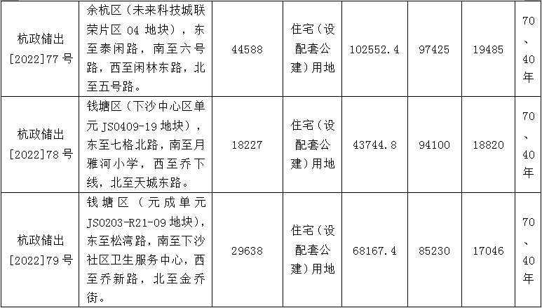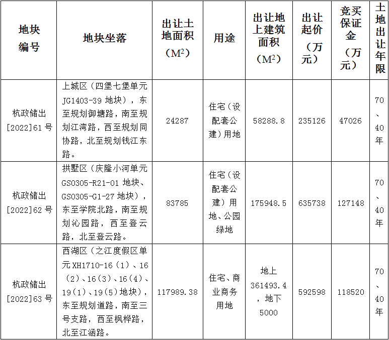 具体来看,9宗地块中,起始价最高的地块为杭政储出[2022]62号地块,该地块位于拱墅区(庆隆小河单元GS0305-R21-01地块、GS0305-G1-27地块),东至学院北路,南至规划沁园路,西至登云路,北至登云路。按照出让公告,地块出让面积83785平方米,地块用途为住宅(设配套公建)用地、公园绿地;地块起始价63.57亿元。