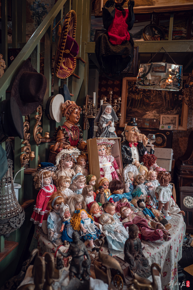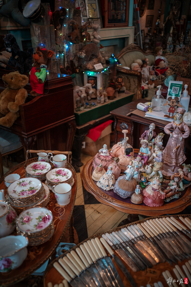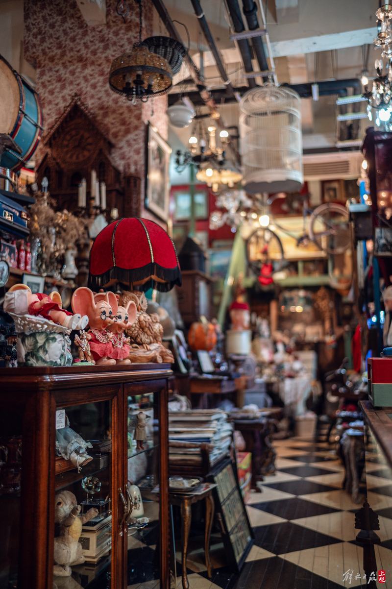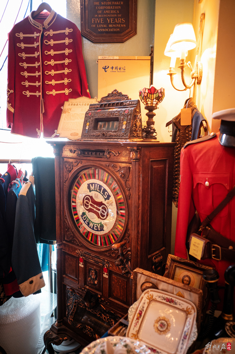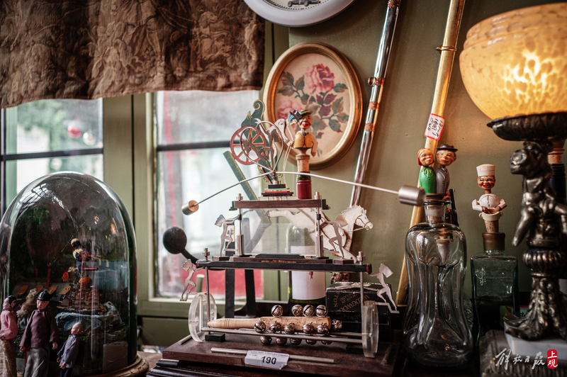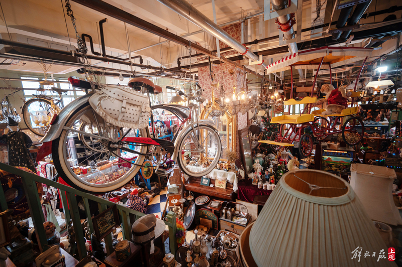 纹理斑驳的柜台上下,盛放着徽章、瓷器、洋娃娃;狭窄的过道旁,点唱机、游艺机、古董钢琴、100多岁的大型八音盒一字排开;高高的天花板上,欧式大小吊灯、古董自行车、跳舞的人偶,被天马行空地四处悬吊着。