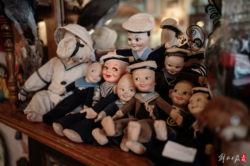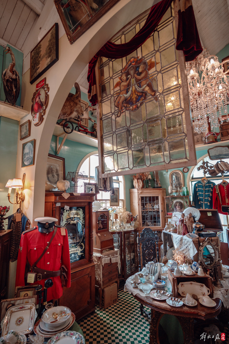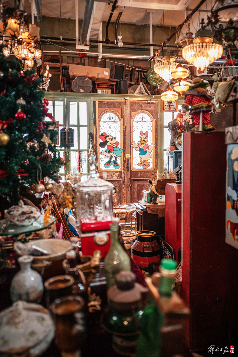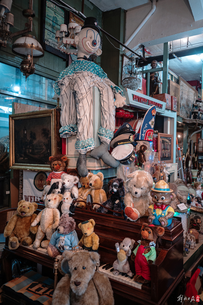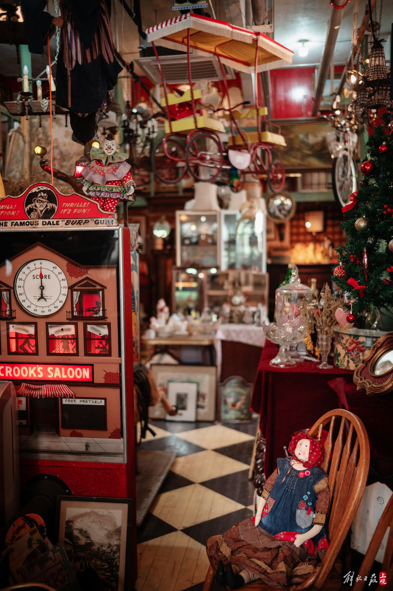 纹理斑驳的柜台上下,盛放着徽章、瓷器、洋娃娃;狭窄的过道旁,点唱机、游艺机、古董钢琴、100多岁的大型八音盒一字排开;高高的天花板上,欧式大小吊灯、古董自行车、跳舞的人偶,被天马行空地四处悬吊着。