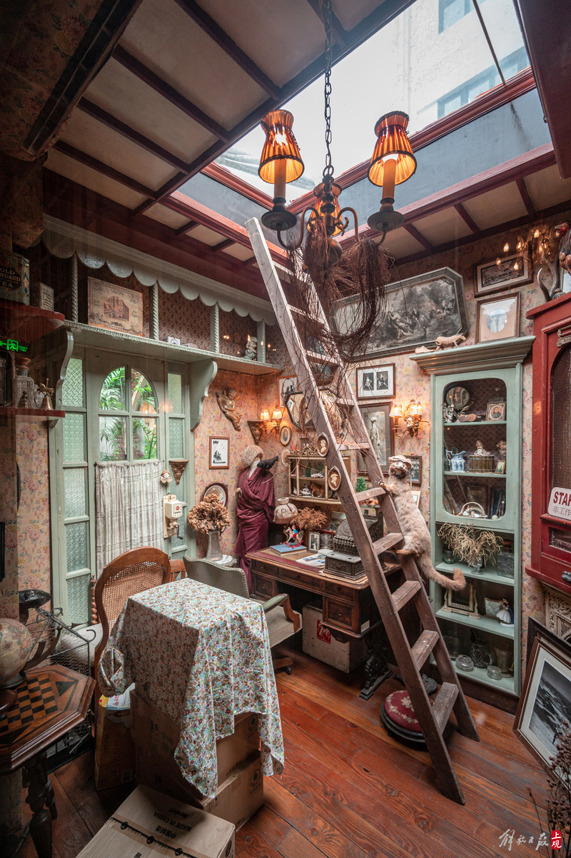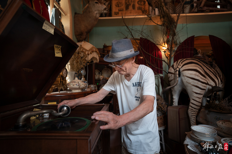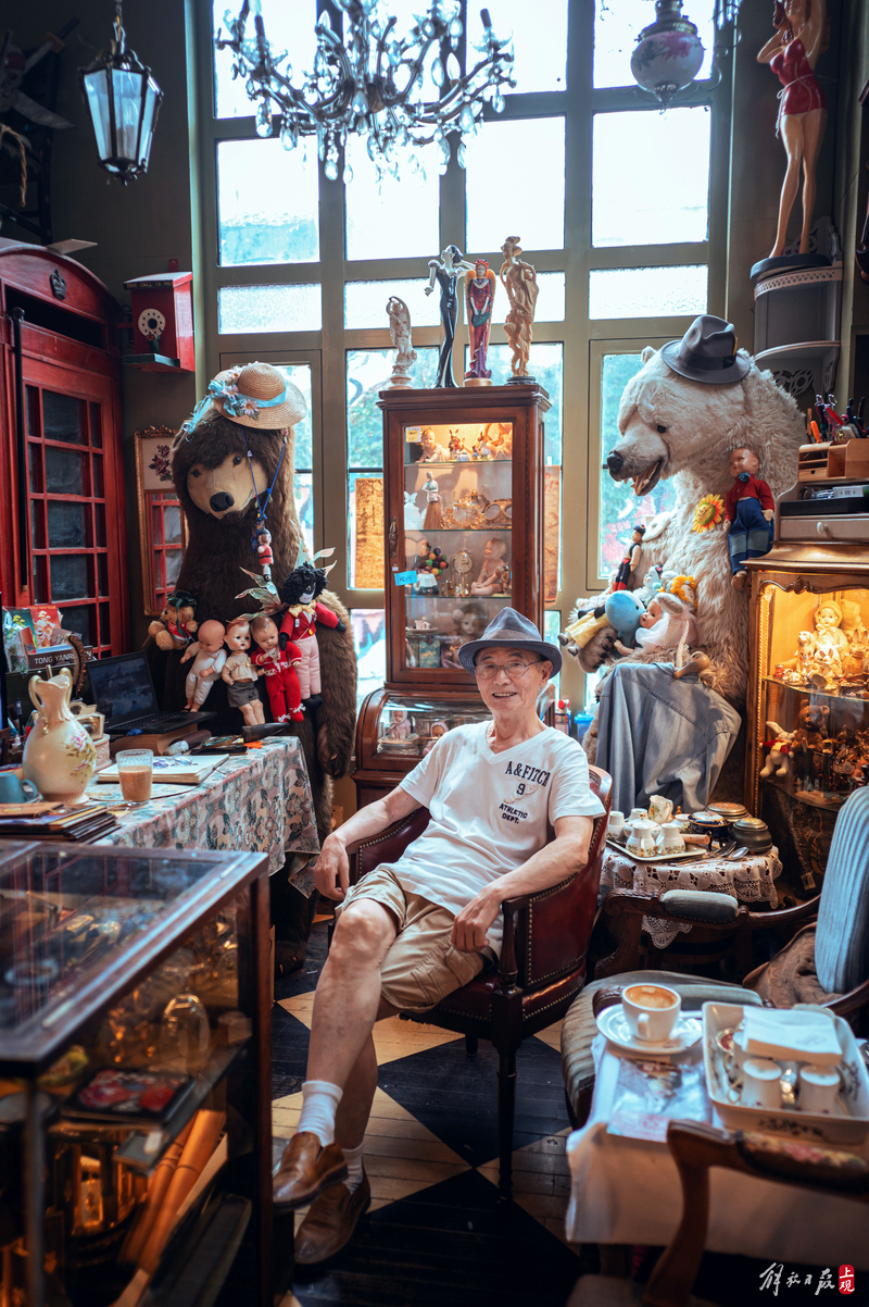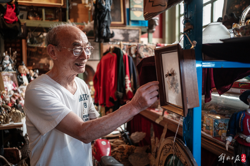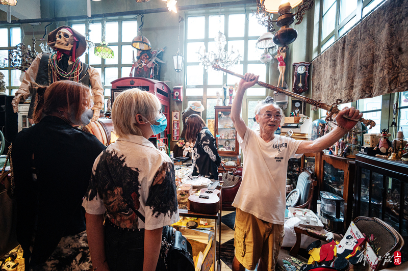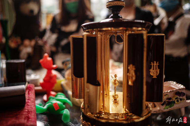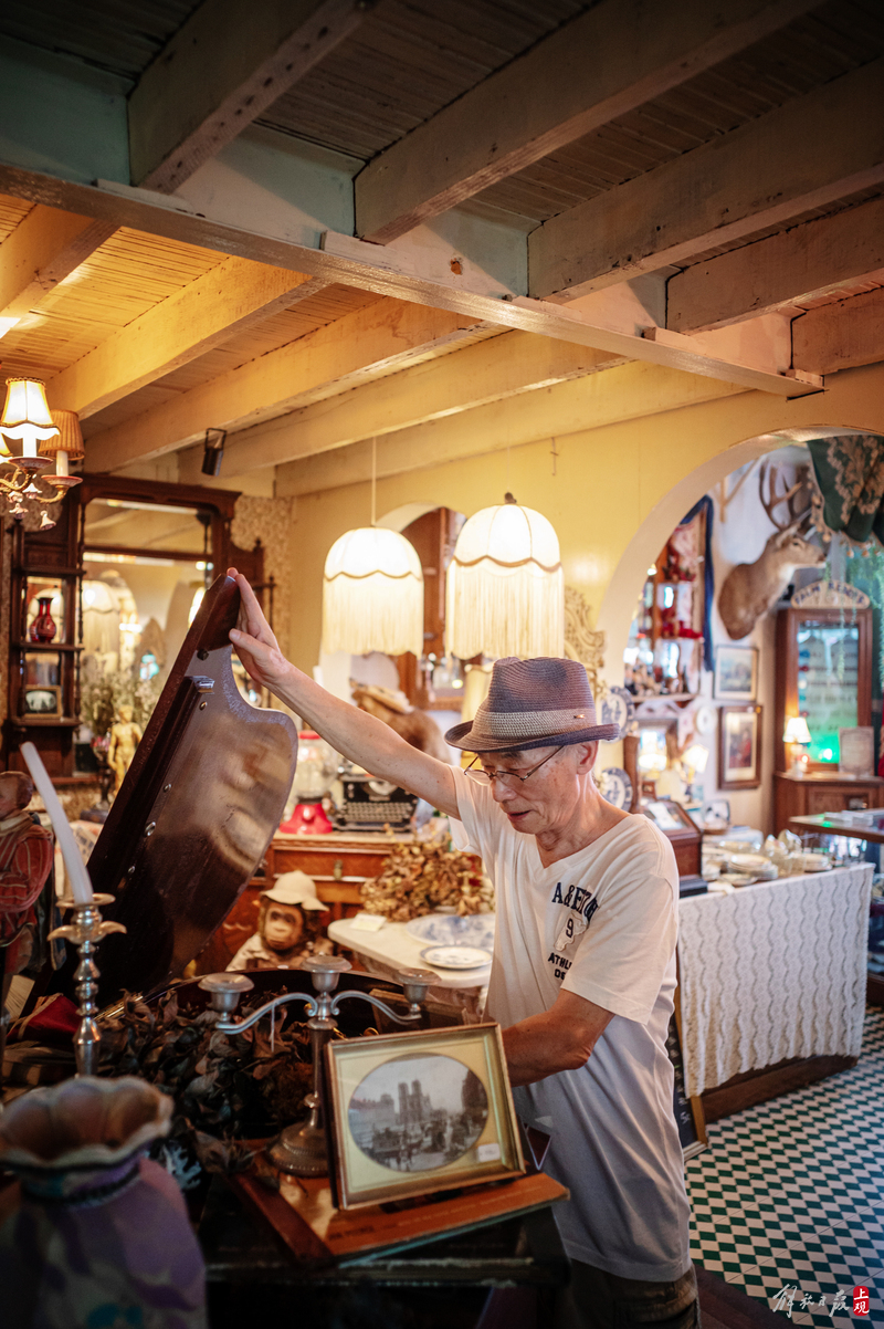 纹理斑驳的柜台上下,盛放着徽章、瓷器、洋娃娃;狭窄的过道旁,点唱机、游艺机、古董钢琴、100多岁的大型八音盒一字排开;高高的天花板上,欧式大小吊灯、古董自行车、跳舞的人偶,被天马行空地四处悬吊着。
