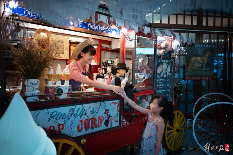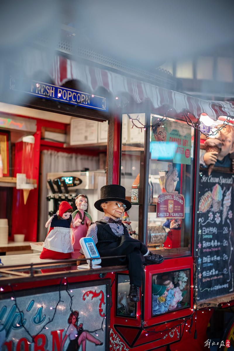 摆放在中庭里的一辆红色古董爆米花车灯光耀眼,造型奇特,周身的每一个细节都提醒人们,它来自遥远的时空。