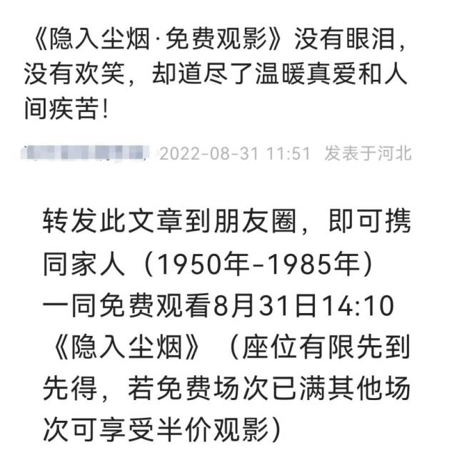 新版文章中,最受网友吐槽的“老人(1970年-1985年)”的描述字样已经没了,改为了:“转发此文章到朋友圈,即可携同家人(1950年-1985年)一同免费观看8月31日14:10《隐入尘烟》。”