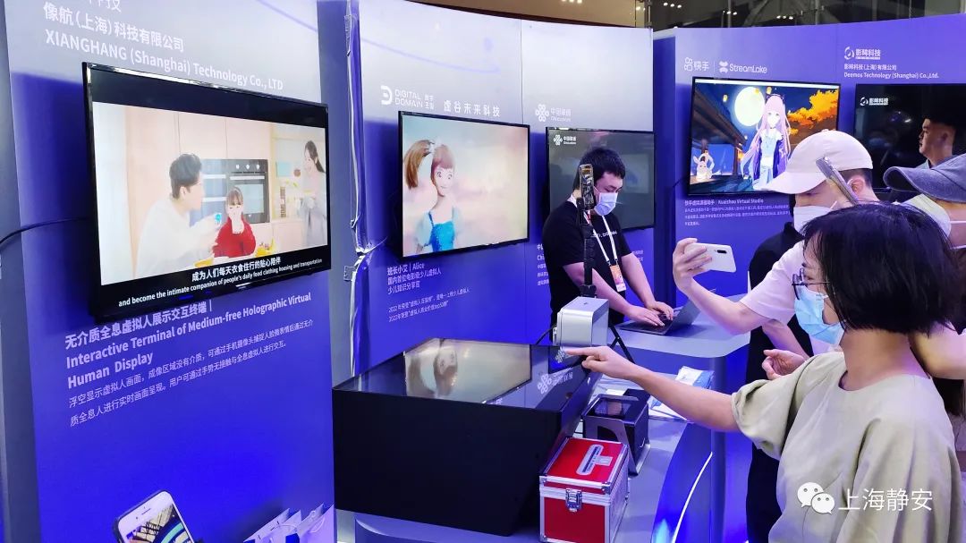 记者在现场发现,很多观众都好奇地在展台前与无介质全息虚拟人展示交互终端进行互动体验。据悉,该产品通过手机摄像头对人脸进行面部捕捉,经过相应的3d建模,通过无介质全息设备进行同步展示,可应用于虚拟人物直播、远程教育等领域。