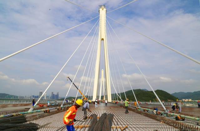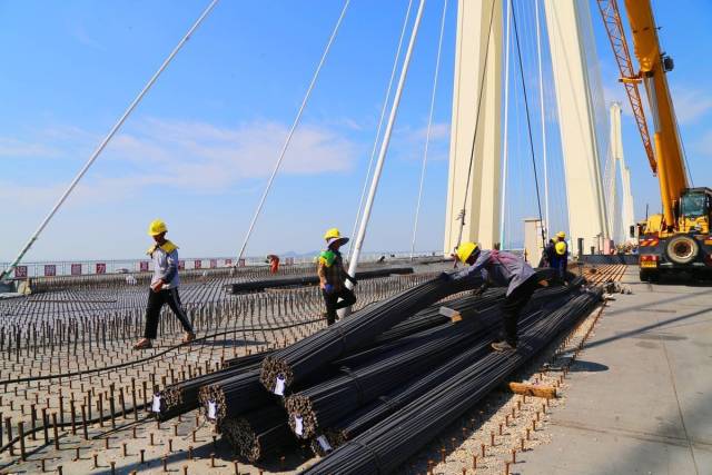 横琴互通立交的建设是实现金海大桥与横琴大道、横琴二桥衔接的关键节点。来自中铁六局的400多名建设者正抓紧推进上部结构剩余34跨现浇梁的混凝土浇筑,目前横琴互通立交走向“脉络”已现。近期珠海天气晴好,正是混凝土浇筑作业最佳时期,工地一派忙碌景象。在刚刚合龙的金海大桥磨刀门斜拉桥段,来自中铁大桥局的近500名建设者假期坚守岗位,稳步推进桥面剪力钉施工和钢筋绑扎施工,以确保大桥10月进入铁路铺轨阶段。
