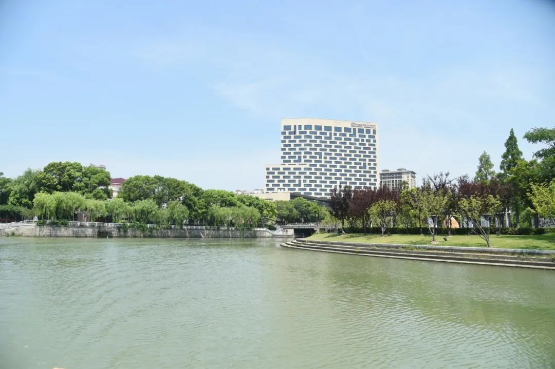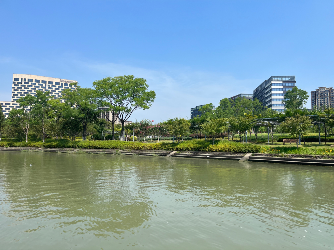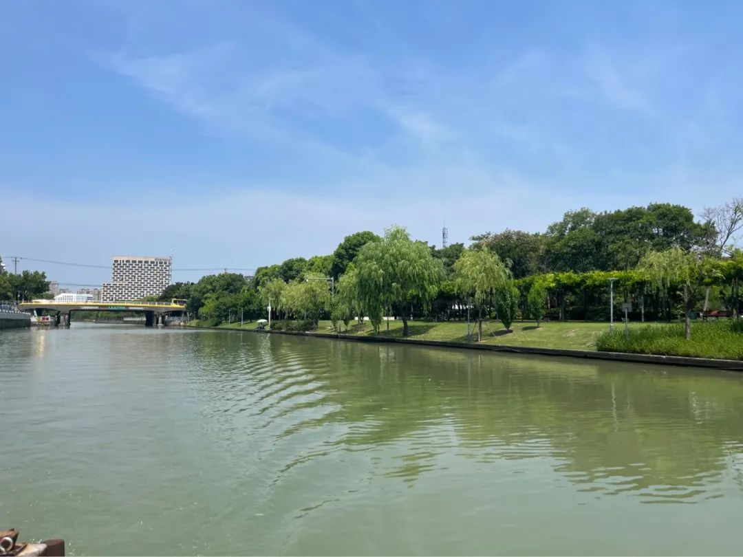 从永靖路南侧环城河绿带出发,一路往西,环城河河面宽阔,碧波荡漾。放眼望去,两岸绿意盎然,高楼耸立,深厚的文化底蕴与繁华的都市美景融为一体,移步皆是景色。环城河南侧为嘉定老城区,北侧即为菊园新区。作为上海唯一保存完好且依旧具备实用功能的古代护城河道,6.5公里长的嘉定环城河如今已成一处文化标志水岸,串联起了沿岸公园绿地。