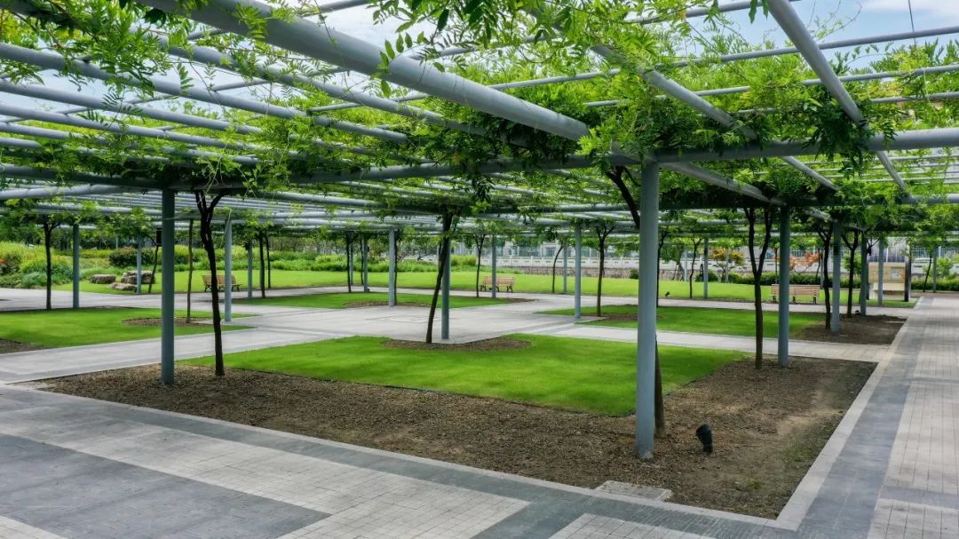 舟行至李园桥西侧,五一广场、紫云廊相继映入眼帘。2019年,紫云廊建成开放,这是继嘉定紫藤园后的另一座紫藤专类园,是嘉定环城河外圈绿道的重要景观节点。园内共配有紫藤花架3480平方米,精选栽植了牛岛、熊野、阿知等7个品种的149株紫藤。