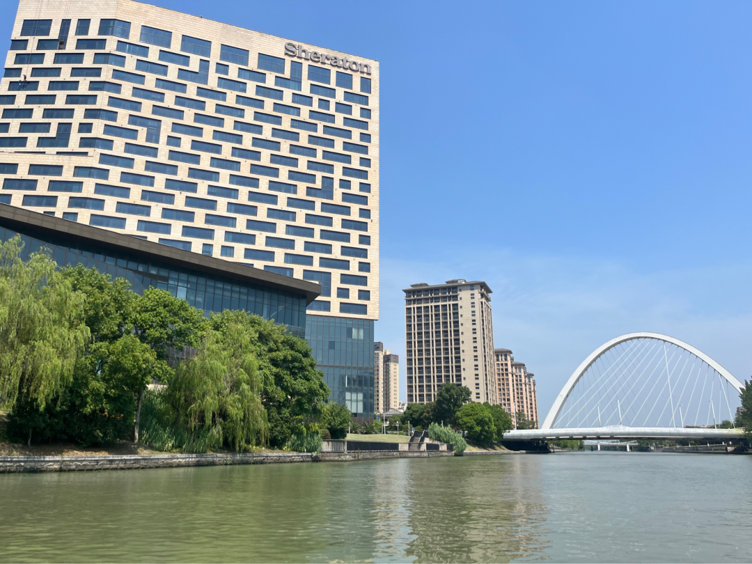 与信业购物中心隔河相望的是喜来登酒店。这是上海第五家、嘉定第一家喜来登品牌的五星级酒店,2015年8月开业后,成为菊园新区的地标性建筑。