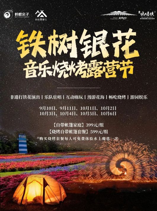 随着高温天的远离,露营旅行也正式步入秋日旺季。中秋首日,携程平台上露营预订量相较端午同期增长近60%。周浦花海景区就在9月10日、11日推出了“铁树银花音乐烧烤露营节”,在月夜之下既可聆听摇滚乐队驻场演出、品尝自助烧烤,也可欣赏来自河南的非遗打铁花表演。