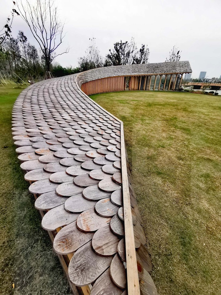 作为对开放景观空间的创新尝试,移动驿站采取的是木构形式,通过小而美的设计,打造与景观相呼应的停留空间,通过加载多元功能,丰富公园的配套设施,为游客提供一些服务。在形式上,自然亲近的木材,具有装置感的形式,给公园景观带来了新意和活力。