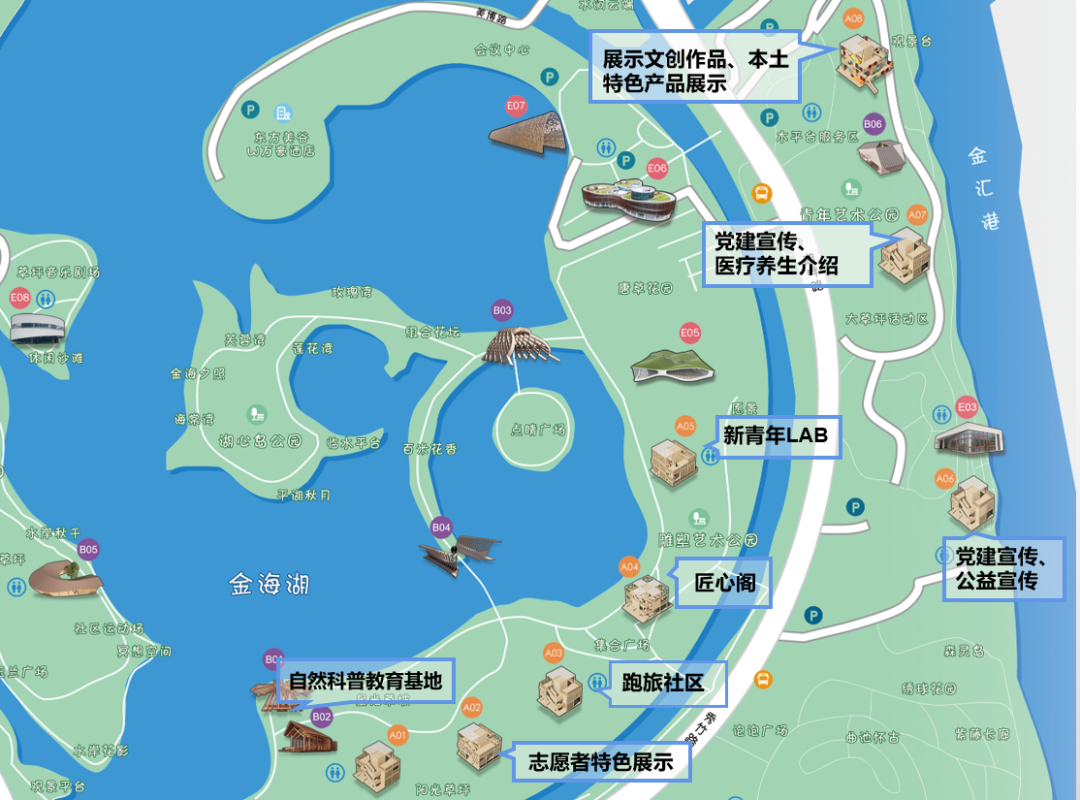 为了更好服务市民需求,上海之鱼内多个移动驿站已完成装修。移动驿站是根据上海之“鱼”和“十字水街”的基底,采用“日晷”式布局,以金海湖湖心为圆心,在城市公园内用放射状网格植入多个驿站景观空间。