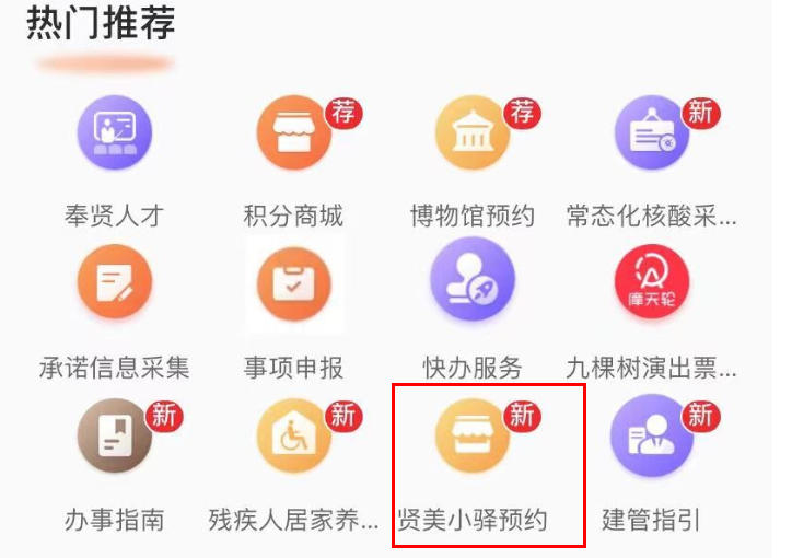 打开随申办“APP”奉贤旗舰店,在主页“热门推荐”栏中点击“贤美小驿预约”服务。