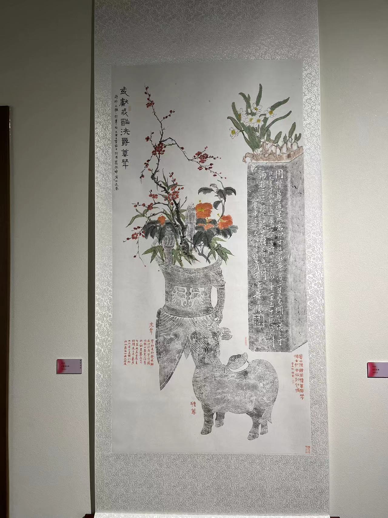 书画展上,展出了西泠印社副社长、金石书画家童衍方先生及其弟子以金石文化为主题的近70件作品。展品中除书画篆刻外,还有砚台紫砂壶铭刻,以及三代古陶、汉晋砖瓦、石刻造像等拓本题跋作品。